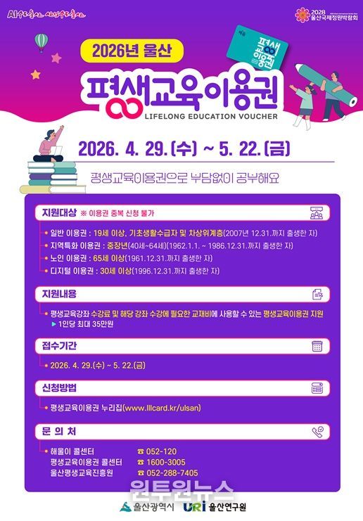 (원투원뉴스) 울산시가 경제적 여건에 따른 교육격차를 완화하고, 성인의 자아실현을 지원하기 위해 ‘2026년 평생교육이용권 지원사업’의 2차 신청 접수에 나선다.
