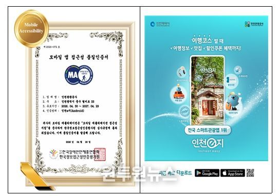 (원투원뉴스) 인천광역시(시장 유정복)는 스마트관광 플랫폼 ‘인천e지’ 앱(APP)이 관광약자를 배려한 서비스 구현의 우수성을 인정받아, ‘모바일 앱 접근성 품질인증(Mobile Accessibility)’을 3년 연속 획득했다고 밝혔다.