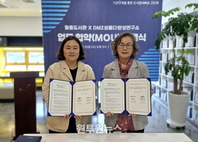 (원투원뉴스) 파주시 월롱도서관은 지난 22일 디엠지(DMZ)생물다양성연구소와 지역사회 독서진흥 및 생태환경 분야 협력을 위한 업무협약을 체결했다.