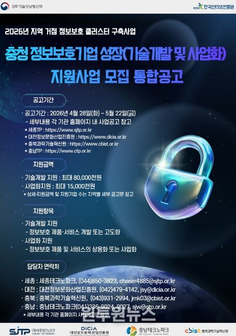 (원투원뉴스) 세종테크노파크는 정보보호 유망기업 발굴 및 성장 지원을 위해 ‘정보보호 성장(기술개발 및 사업화) 지원사업’ 충청권 통합공고를 4월 28일부터 진행한다고 밝혔다.