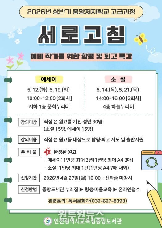 (원투원뉴스) 인천광역시교육청중앙도서관은 4월 27일부터 예비 작가를 위한 ‘중앙저자학교 고급과정’ 참여자를 모집한다.