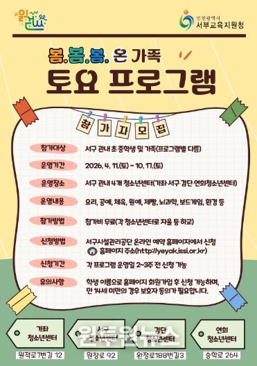 (원투원뉴스) 인천서부교육지원청은 4월 11일부터 10월 17일까지 ‘2026 서부 방과후·돌봄 지역연계(봄봄봄) 온 가족 토요 프로그램’을 운영한다.