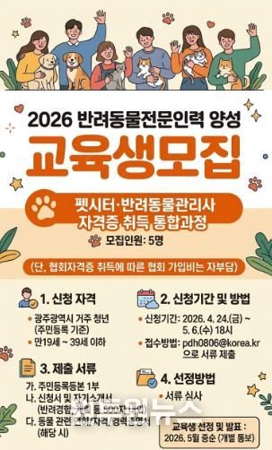 (원투원뉴스) 광주광역시는 반려동물 산업 성장에 대응하고 전문역량을 갖춘 인재 양성을 위한 ‘2026년 반려동물 전문인력 양성교육’을 실시한다.