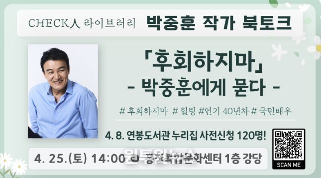 (원투원뉴스) 홍천 군립 도서관이 오는 4월 25일 오후 2시 홍천 복합 문화센터 1층 강당에서 배우 겸 작가 박중훈을 초청해 2026년 ‘체크인 라이브러리’의 첫 번째 북토크를 개최한다.