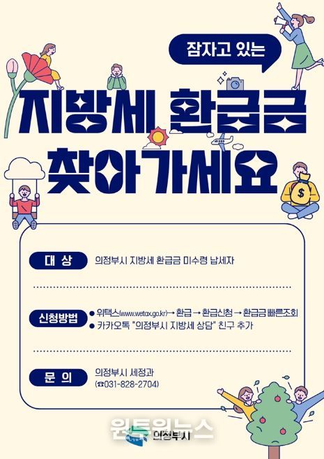 (원투원뉴스) 의정부시는 납세자가 아직 찾아가지 않은 지방세 환급금을 돌려주기 위해 5월 말까지 ‘지방세 환급금 일제정리 기간’을 운영한다.
