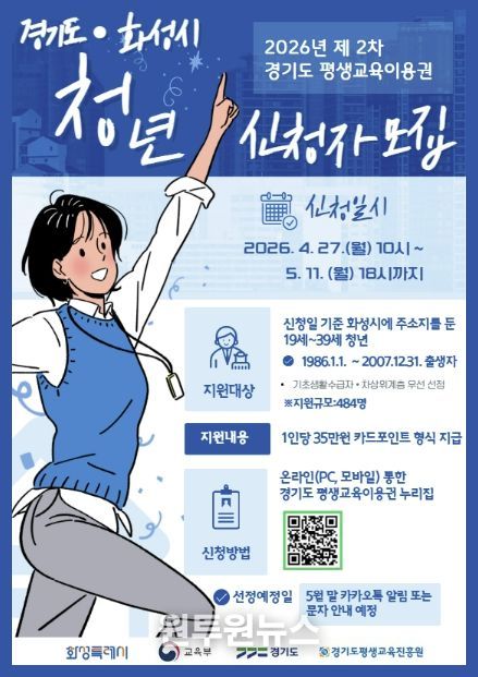 (원투원뉴스) 화성특례시는 청년층의 자기계발과 역량 강화를 지원하기 위해 ‘2026년 평생교육이용권 지원사업’ 지역특화(청년) 분야 2차 이용자를 모집한다고 밝혔다.