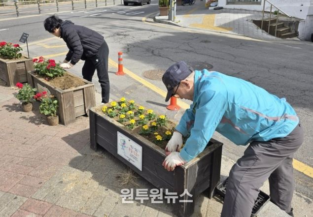 이번 활동은 통장협의회를 중심으로 주민들이 직접 참여하고 주도한 환경정비로, 관내에 설치된 크고 작은 화분 약 40여 개에 다양한 봄꽃을 식재하고 주변 환경을 함께 정비하며 마을 곳곳에 화사한 봄기운을 더했다.