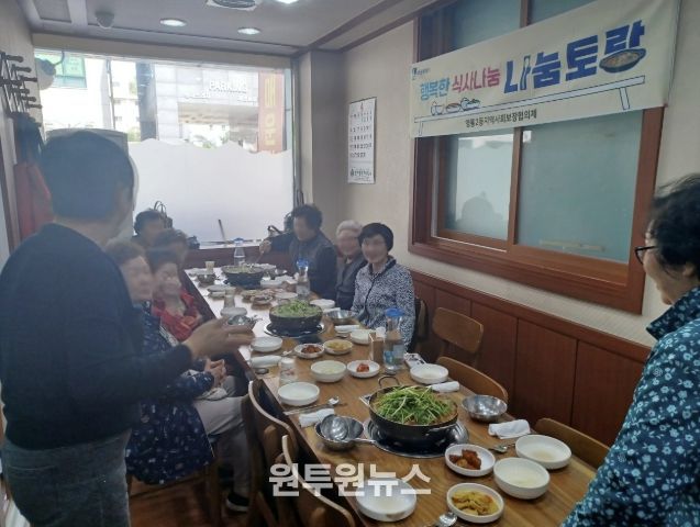 ‘나눔토랑’은 ‘나눔+레스토랑’의 의미를 담은 사업으로, 관내에서 식당을 운영하는 지역사회보장협의체 민경춘 부위원장이 경로당 어르신들을 초청해 매달 한 끼 식사를 대접하는 나눔 활동이다.