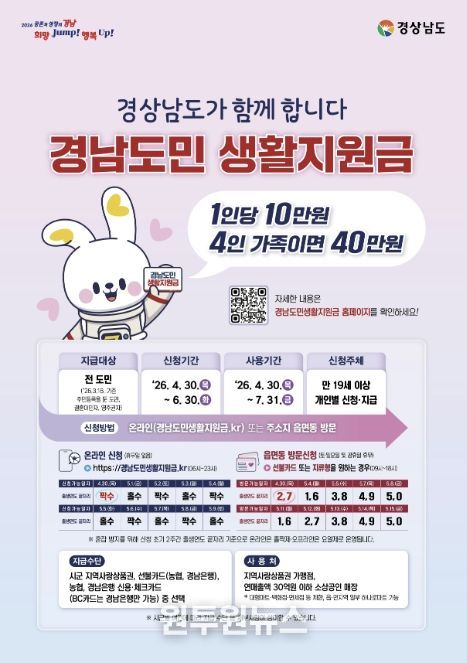 경남도민 생활지원금은 전 군민(2026년 3월 18일 주민등록 기준)을 대상으로 4월 30일부터 6월 30일까지 지급된다. 지원금액은 1인당 10만 원이며, 지급수단은 창녕사랑상품권, 신용·체크카드(농협-경남은행), 선불카드 등이다.