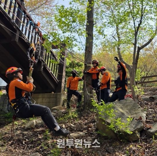 이날 훈련은 ▲ 로프를 활용한 위험지역 접근 및 인명구조 ▲들것을 활용한 구조대상자 이송 ▲산악지형 위험요소 파악 및 안전관리 ▲계곡 지형을 활용한 풍수해 대비 수난구조 기법 등 다양한 상황을 가정해 실전처럼 이뤄졌다.