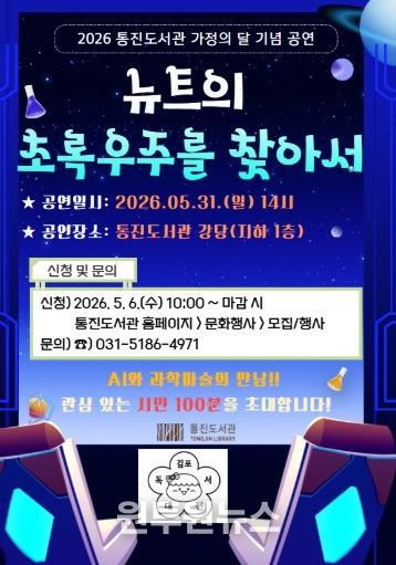(원투원뉴스) 김포시 통진도서관이 가정의 달을 맞아 온 가족이 함께 즐길 수 있는 공연 '뉴트의 초록우주를 찾아서'를 오는 5월 31일 오후 2시 통진도서관 강당에서 개최한다.