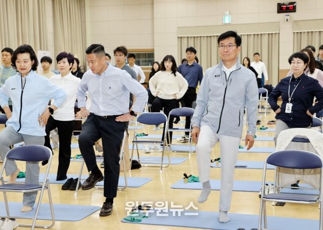 24일 본청 화합관에서 전 직원을 대상으로 시범 프로그램을 운영했으며, 윤건영 교육감이 참석해 직원들과 함께 스트레칭과 건강관리 활동에 참여했다.