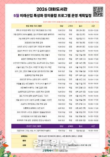 (원투원뉴스) 고양특례시 대화도서관은 가정의 달을 맞아 오는 5월 ‘미래산업 특성화 창의융합 프로그램’을 운영한다고 24일 밝혔다.