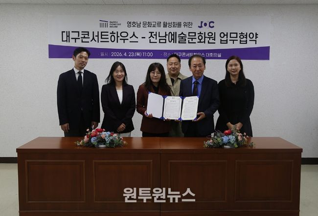 (원투원뉴스) 대구문화예술진흥원 대구콘서트하우스는 4월 23일 전남예술문화원(대표 마윤미)과 영호남 문화교류 활성화를 위한 업무협약을 체결했다.