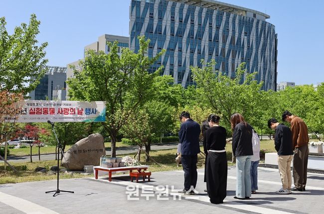 전임상센터 동물사랑비 앞에서 진행된 행사에는 박구선 이사장을 비롯한 전임상센터 연구원 50여 명이 참석한 가운데 추모문 낭독 및 묵념, 헌화 순으로 진행됐다.