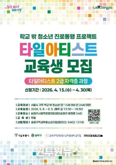 (원투원뉴스) 송파구는 서울시 ‘약자와의 동행’ 공모사업으로 학교 밖 청소년들의 사회진입과 자립을 돕기 위한 ‘타일아티스트 교육’을 실시한다고 24일 밝혔다.