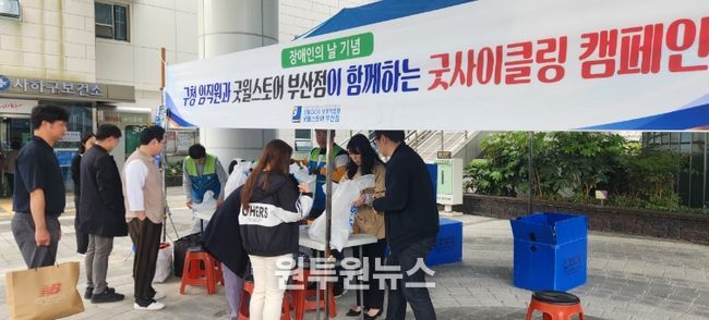 (원투원뉴스) 부산 사하구는 제46회 장애인의 날(4월 20일)을 맞아 지난 4월 23일 사하구청 본청 및 제2청사에서 중증장애인 직업재활시설 ‘굿윌코리아 보호작업장’(시설장 김성태)과 함께 '굿사이클링' 기부 물품 나눔 행사를 개최했다.