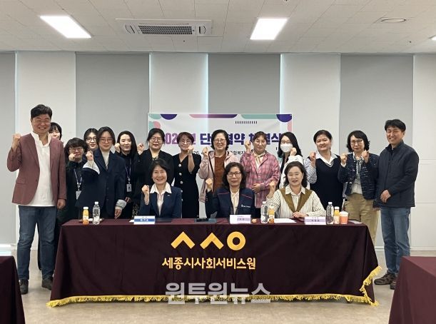 (원투원뉴스) (재)세종시사회서비스원(원장 이기순) 산하 아이돌봄서비스제공기관(센터장 김지현)은 23일 원내에서 공공&돌봄노동조합과 단체협약 체결식을 개최하고, 돌봄서비스의 질 향상과 종사자 권익 증진을 위한 상호 협력을 약속했다.