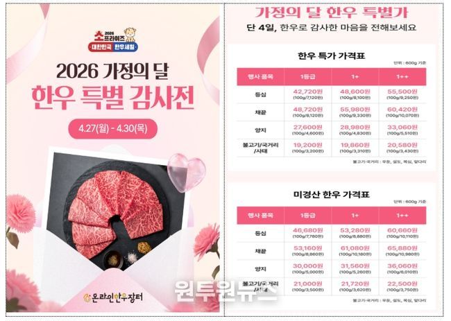 (원투원뉴스) 농림축산식품부는 가정의 달을 맞아 한우자조금, 전국한우협회, 농협경제지주와 협력하여 4월 27일부터 5월 10일까지 14일 동안 농축협 하나로마트, 대형마트 및 주요 온라인몰 등에서 ‘소(牛)프라이즈 대한민국 한우고기 할인행사’를 실시한다고 밝혔다.