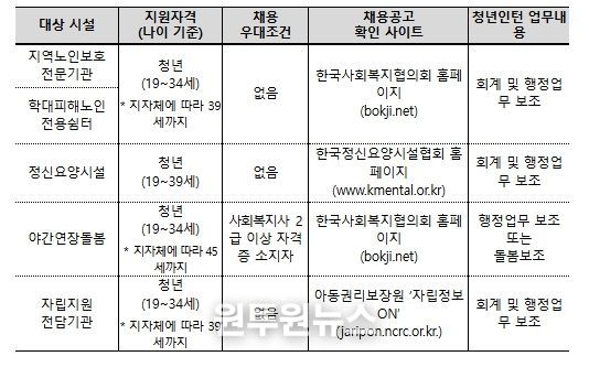 이번 모집을 통해 선발되는 479명의 청년인턴은 전국 아동·노인·정신요양 시설 등 5개 유형의 시설에서 근무하게 된다.