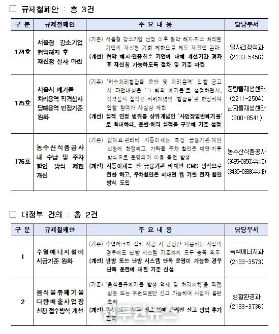 시는 자체적으로 개선 가능한 ▴서울형 강소기업 협약해지 후 재신청 절차 마련(174호) ▴서울시 폐기물 처리용역 적격심사 당해용역 인정기준 완화(175호) ▴농수산식품공사 내 수납 및 주차할인 방식 제한 개선(176호) 과제는 정비하고, ▴수열에너지 설비 시공기준 완화, ▴음식물류폐기물 다량배출사업장 신청․접수방식 개선 등 2건은 정부에 공식 건의했다.