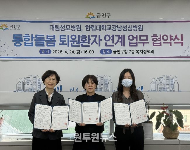 (원투원뉴스) 금천구는 지난 24일 대림성모병원, 한림대학교강남성심병원 등 2개소와 통합돌봄 퇴원환자 지역사회 연계를 위한 업무협약을 체결했다고 밝혔다.