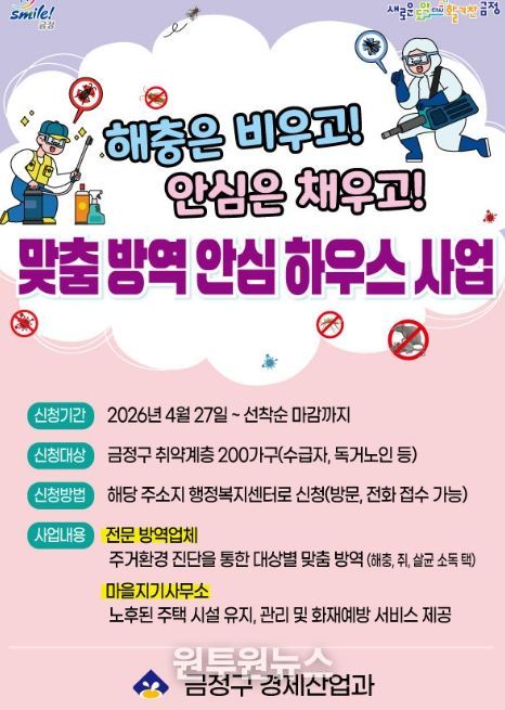 (원투원뉴스) 부산 금정구는 관내 취약계층의 쾌적하고 안전한 주거 환경 조성을 위해 ‘맞춤 방역 안심하우스’ 사업을 추진하고, 오는 4월 27일부터 대상 가구를 모집한다고 밝혔다.