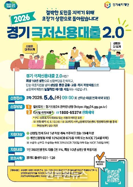 (원투원뉴스) 경기도가 5월 6일 오전 9시부터 금융취약계층의 생활 안정을 지원하는 ‘경기 극저신용대출 2.0’ 2차 접수를 시작한다.