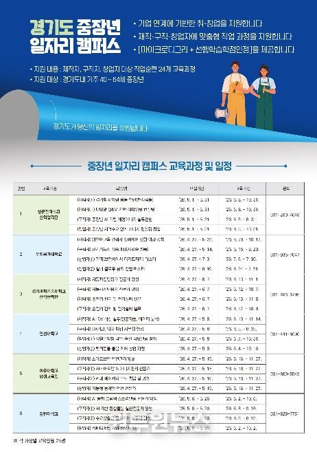 중장년층의 취·창업 희망과 기업의 인력 수요를 연계해 맞춤형 교육을 제공하는 프로그램으로, 도내 40세 이상 65세 미만 중장년이 대상이다.