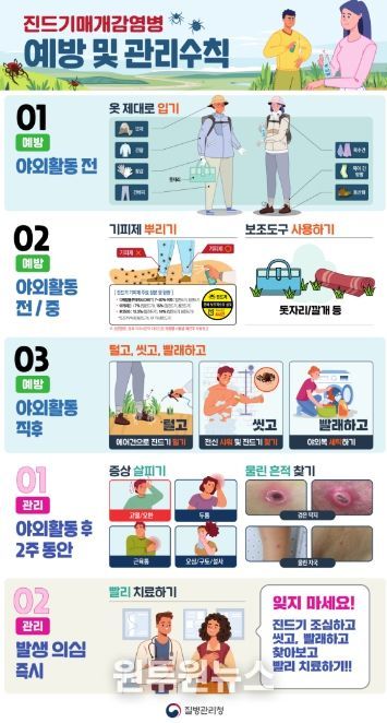 보건소 관계자는 “야외활동 시 진드기에게 물리지 않도록 예방수칙을 철저히 준수해야 한다”라며, “진드기에 물린 후 2주 이내에 38도 이상의 발열이나 소화기 증상이 나타나면 즉시 의료기관을 방문해 진료를 받아야 한다”라고 강조했다.