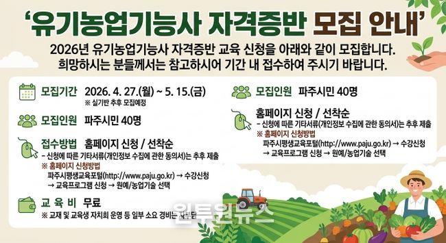 (원투원뉴스) 파주시농업기술센터는 친환경농업 분야 농업 전문 인력 육성을 위한 '2026년 유기농업기능사 자격증 취득’교육생을 4월 27일부터 5월 15일까지 모집한다.