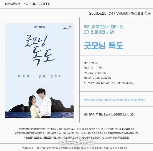 오는 4월에는 뮤지컬 '굿모닝 독도'를 상영한다. 이 작품은 예술의전당이 제작한 창작 뮤지컬로 사랑과 역사적 의미를 함께 풀어낸 작품이다. 독도를 지키며 살아온 할아버지와 그의 손자 시우의 이야기를 중심으로 전개되며, 시우가 일본인 연인 유코와의 결혼을 꿈꾸는 과정에서 할아버지의 반대에 부딪히여 갈등이 펼쳐진다. 독도를 둘러싼 역사적 배경과 상징성을 바탕으로 ‘기억’과 ‘정체성’, 그리고 ‘공존’에 대한 메시지를 전달한다. 시우와 유코, 그리고 할아버지의 관계는 갈등과 이해의 과정을 거치며 점차 변화하고, 관객들에게 깊은 울림과 여운을 남긴다.