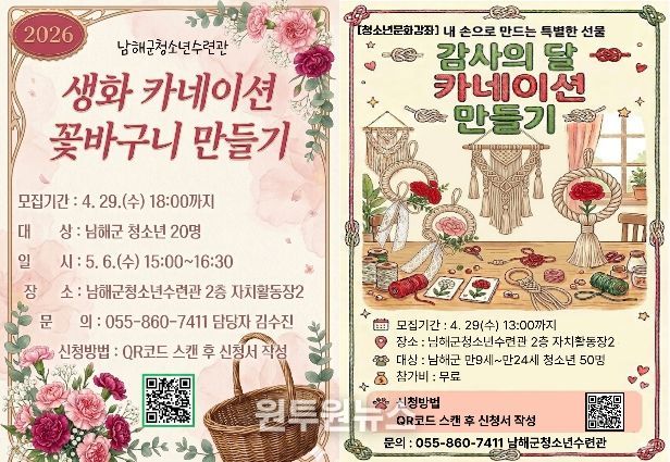 (원투원뉴스) 남해군 청소년수련관은 가정의 달 5월과 어버이날을 맞아 청소년 대상 문화체험 프로그램 ‘카네이션 만들기 원데이클래스’를 운영한다고 밝혔다.