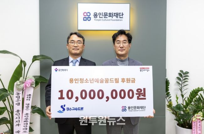 (원투원뉴스) 용인문화재단은 지난 23일 경수고속도로(주)로부터 용인시 관내 청소년 예술 장학사업인 ‘용인청소년예술꿈드림’ 지원을 위한 기부금 1,000만 원을 기탁받았다고 밝혔다. 이번 후원은 용인서울고속도로를 이용하는 통행차량 1대당 1원씩 적립하고, 사회공헌예산을 추가로 편성해 지역사회 환원과 기업의 사회적 책임 실천 차원에서 추진됐다.