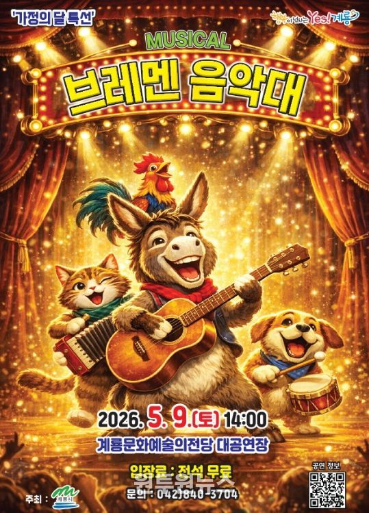 (원투원뉴스) 충남 계룡시는 5월 가정의 달을 맞아 어린이 가족이 함께 즐길 수 있는 기획공연, 가족뮤지컬'브레멘 음악대'를 오는 5월 9일 오후 2시 계룡문화예술의전당 대공연장에서 선보인다.