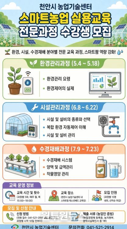 (원투원뉴스) 천안시농업기술센터는 5~ 7월 ‘스마트농업 실용교육 전문과정’을 운영한다고 27일 밝혔다.