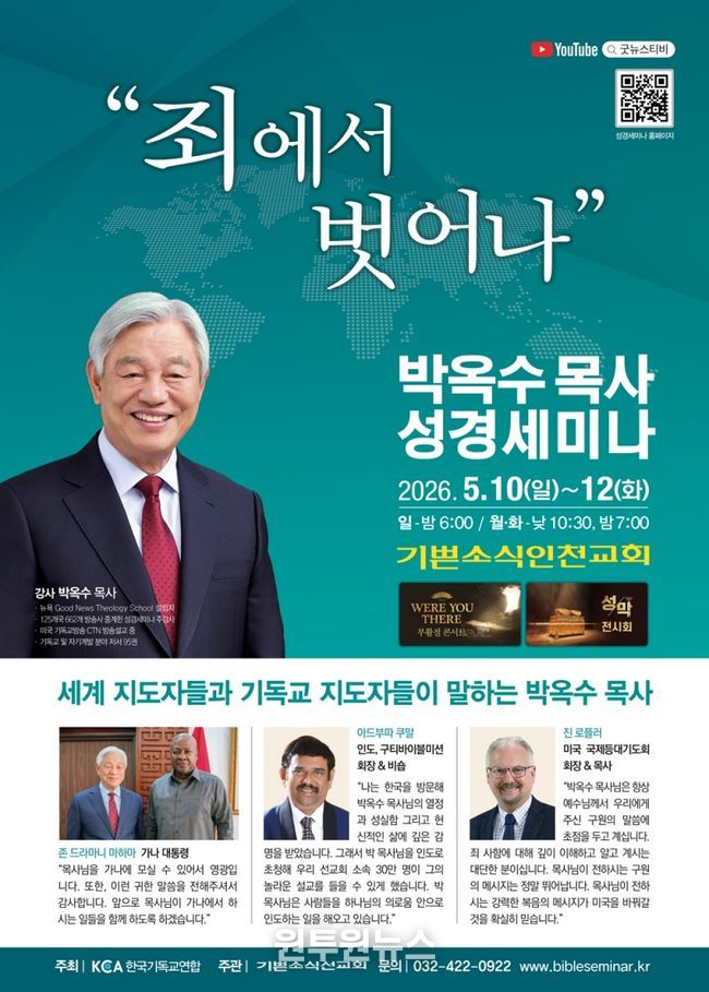 (원투원뉴스) ‘2026 박옥수 목사 성경세미나’가 5월 10일(일)부터 12일(화)까지 3일간 기쁜소식인천교회에서 열린다.