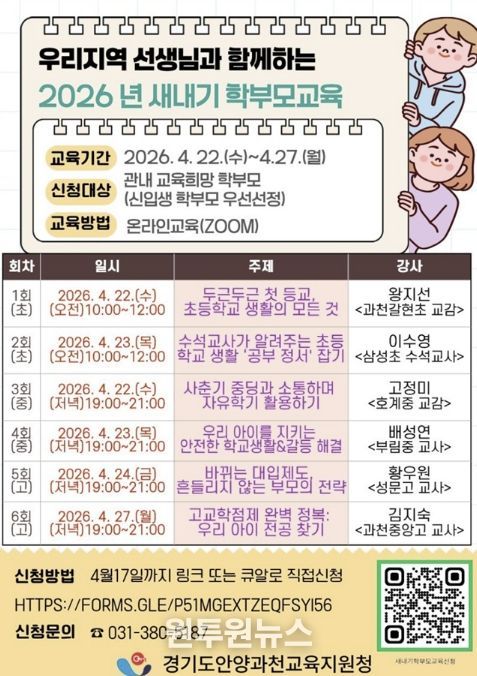 (원투원뉴스) 경기도안양과천교육지원청은 오는 4월 22부터 27일까지 관내 신입생 학부모를 대상으로 ‘우리지역 선생님과 함께하는 2026년 새내기 학부모 교육’을 개최한다.