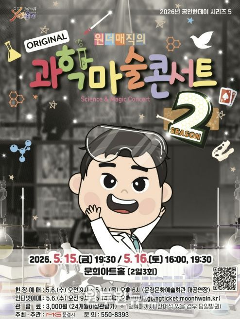 (원투원뉴스) 문경문화예술회관에서는 5월 어린이 달을 맞아 마술과 과학의 경계를 넘나들며 온가족 모두가 재미있게 관람할 수 있는 과학마술콘서트 시즌2 공연을 5월 15일 19:30, 16 16:00, 19:30 (2일 3회)에 문희아트홀에서 개최한다.