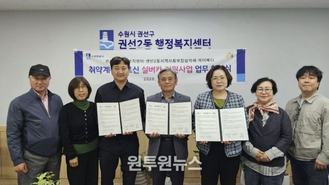 (원투원뉴스) 수원시 권선구 권선2동은 지난 23일, 권선2동 지역사회보장협의체, 케이메디와 취약계층 어르신의 안전한 이동 지원과 삶의 질 향상을 위한 “실버카(보행보조기) 지원사업 업무협약(MOU)”을 체결했다.