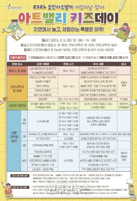 이번 행사는 자연과 예술이 어우러진 포천아트밸리의 공간적 특성을 살려 어린이들에게 다양한 체험 기회를 제공하고, 가족 단위 방문객에게 즐거운 추억을 선사하기 위해 마련됐다.
