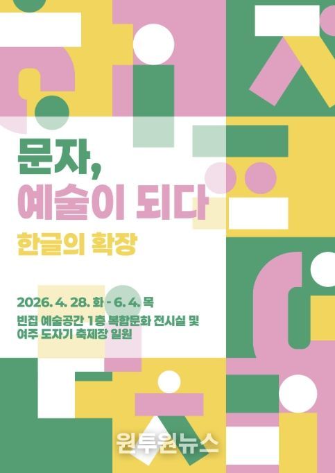 (원투원뉴스) 여주세종문화관광재단은 오는 4월 28일부터 6월 4일까지 빈집 예술공간 1층에서 기획전시 《문자, 예술이 되다 - 한글의 확장》를 개최한다고 밝혔다.