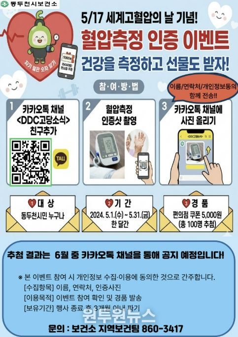 (원투원뉴스) 동두천시보건소는 오는 5월 17일 세계고혈압의 날을 기념해 시민들의 심뇌혈관질환 예방과 건강관리 실천을 유도하고자 ‘혈압측정 인증 이벤트’를 운영한다고 밝혔다.