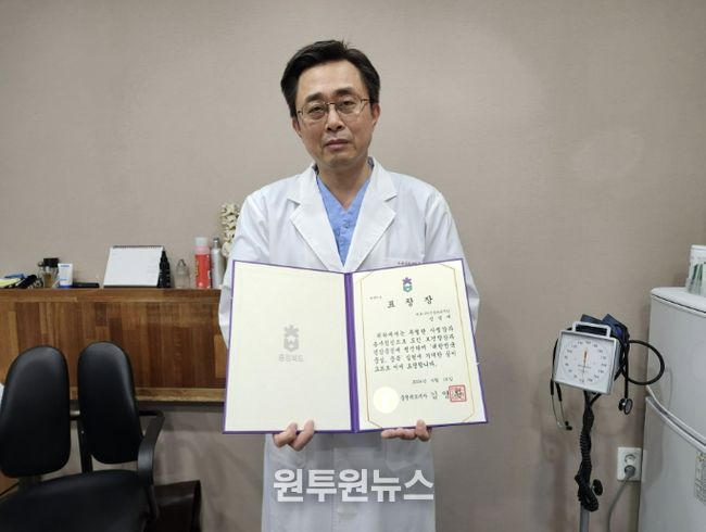 (원투원뉴스) 충주시 소재 베로니카신경외과의원 신성재 원장이 ‘제54회 보건의 날’ 기념행사에서 도민 보건 향상에 기여한 공로를 인정받아 충청북도지사 유공자 표창을 수상했다.