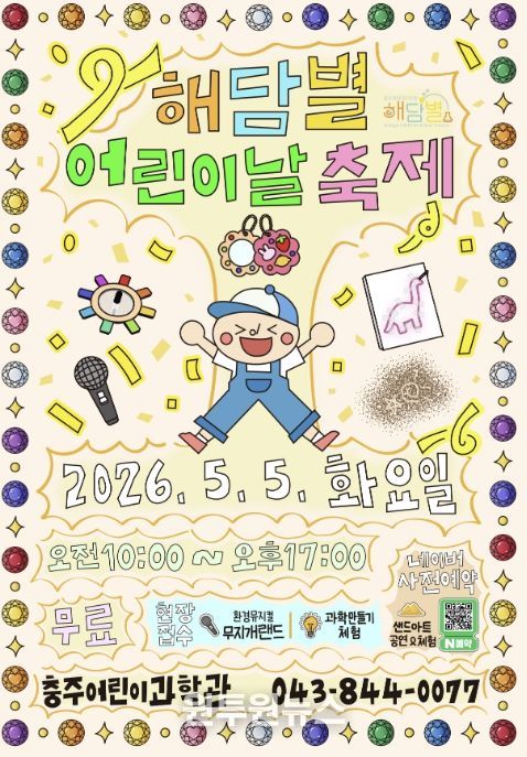 (원투원뉴스) 충주어린이과학관은 오는 5월 5일 어린이날을 맞아 연나이 8세 이하 어린이와 동반 가족을 대상으로 ‘해담별 어린이날 축제’를 무료로 개최한다고 밝혔다.