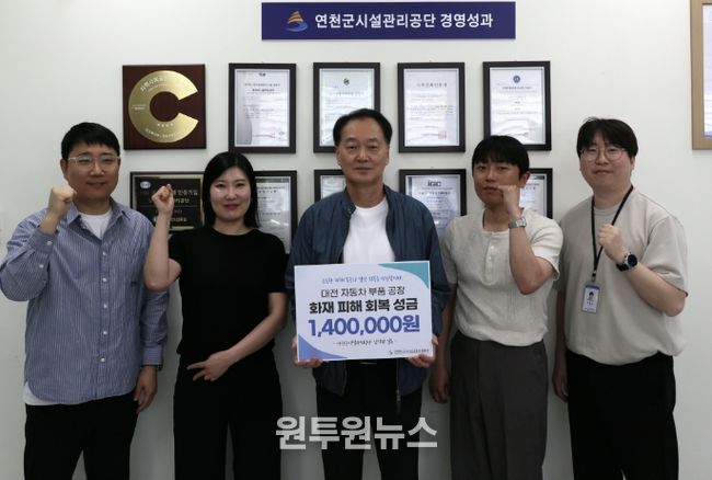 (원투원뉴스) 연천군시설관리공단은 지난 23일 대전 자동차 부품 공장 화재로 피해를 입은 근로자 및 이재민 지원을 위한 성금 1,400,000원을 대한적십자사에 전달했다고 밝혔다.
