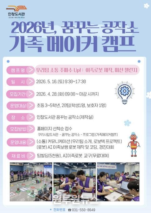 (원투원뉴스) 구리시 인창도서관‘꿈꾸는 공작소’는 오는 5월 16일 초등학생 자녀와 보호자가 함께 참여해 가족 간 유대감을 높이고 인공지능을 체험하는 '우리 팀 소통 주파수 Up! : 이족로봇 제작, 미션 챌린지' 가족 메이커 캠프를 운영한다고 밝혔다.