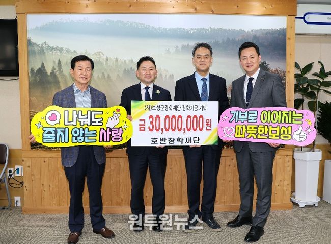 (원투원뉴스) 보성군은 24일 호반장학재단(이사장 김상열)이 지역 인재 양성을 위해 장학기금 3,000만 원을 (재)보성군장학재단(이사장 문찬오)에 기탁했다고 밝혔다.