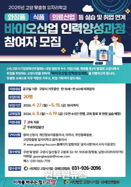 (원투원뉴스) 고양특례시는 2026년 고양맞춤형 일자리학교 공모사업 중 ‘바이오산업 인력 양성과정’의 참여자를 모집한다.