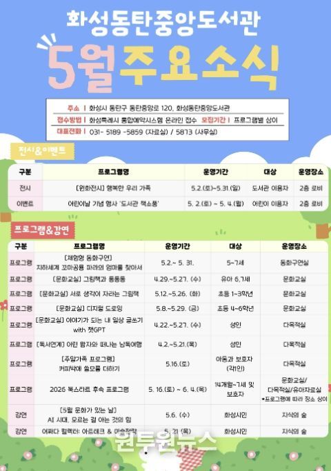 (원투원뉴스) 화성동탄중앙도서관이 어린이날과 가정의 달을 맞아 5월 한 달간 도서관 이용자와 시민을 대상으로 자료실과 3층 공공의 마당 등에서 다양한 문화행사를 운영한다.